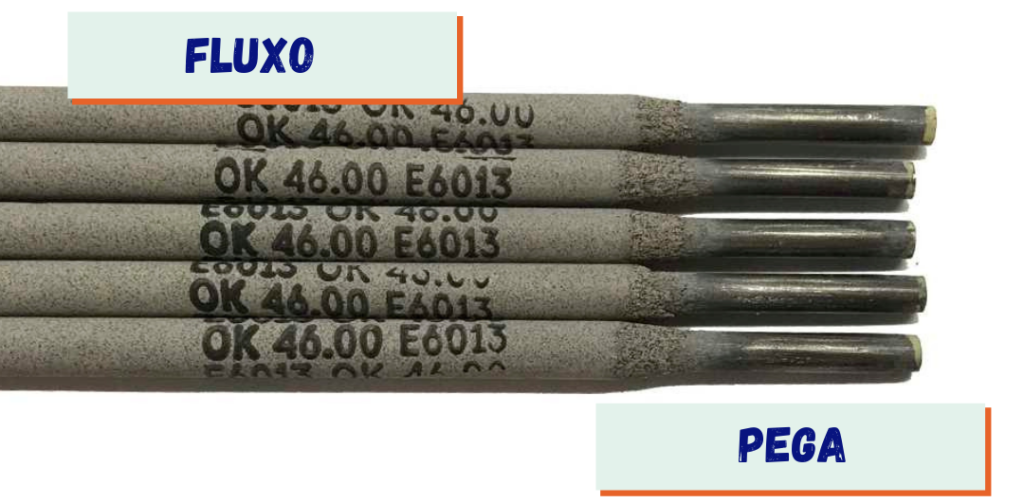 Após o revestimento, uma parte da alma do eletrodo é deixada sem proteção, formando a chamada ponta de pega, que é onde o porta eletrodo será conectado para se realizar o procedimento de soldagem.