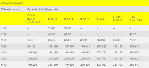 Além desse método, a AWS possui uma tabela que relaciona os tipos de eletrodo, suas bitolas e as correntes de solda correspondentes: