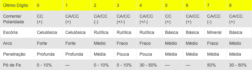 3 = esta numeração indica a corrente e a polaridade com as quais soldar, o tipo de escória depositada, o tipo de arco, a penetração sobre o metal base e a quantidade de pó de ferro. Abaixo, uma tabela com as características desse último algarismo.